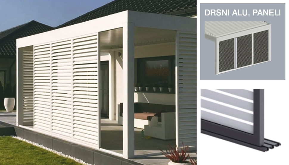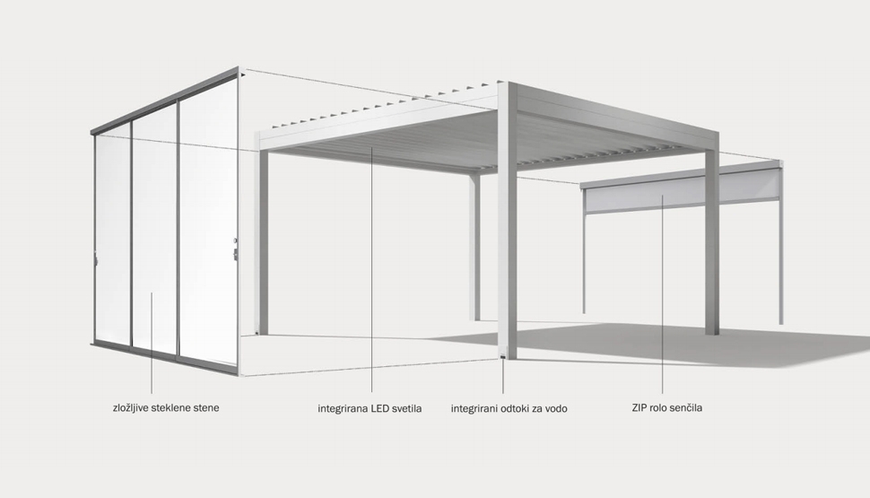 Okvir ostrešja višine 25 cm, vsebuje integrirane motorne pogone ter skrite žlebove. Stebri pergole (13x13cm) so opremljeni z odtoki za meteorno vodo. Modularna konstrukcija je iz prašno barvanega aluminija, s prekatno ojačanimi ALU lamelami dimenzije 24 x 4,2 cm in spojnimi elementi iz nerjavečega jekla.