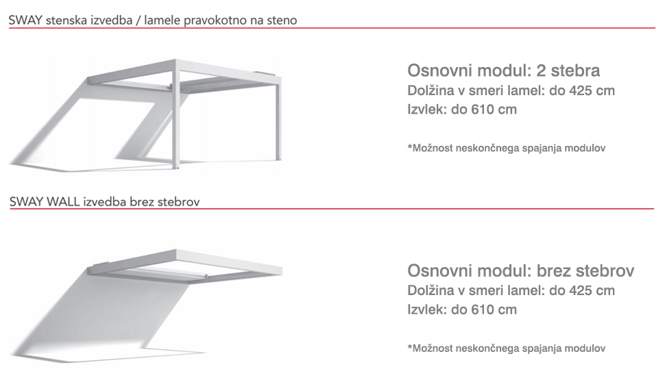 Bioklimatska pergola SWAY je bioklimatska pergola z zložljivim lamelnim ostrešjem. Lamele se s pantografskim mehanizmom hkrati nagibajo in zlagajo, ostreše pa je vodotesno in zrakotesno zaprto.