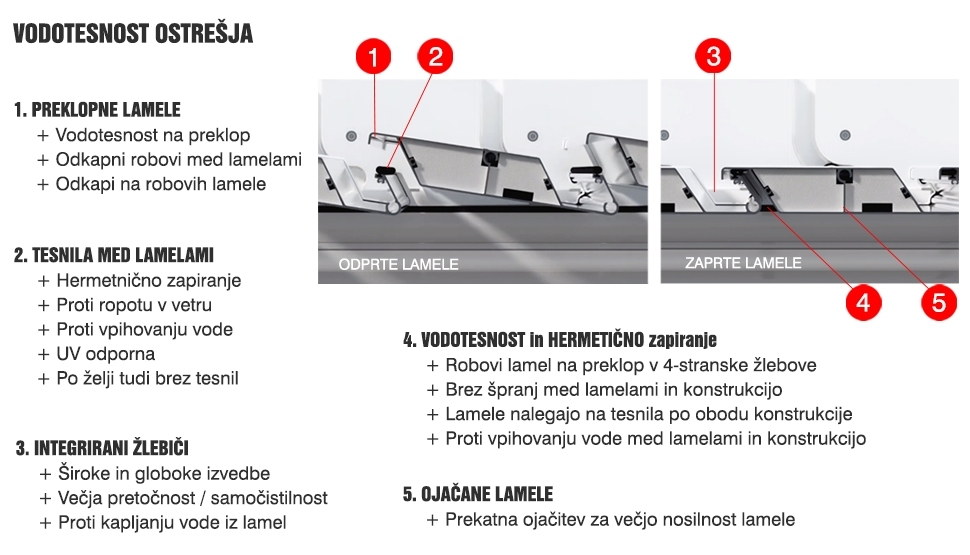 ➤ Vodotesnost ostrešja je zagotovljna z obliko lamel in zapiranjem na preklop ( odkapni rob med lamelami in po obodu ). Oblika lamel omogoča da ostrešje lahko odprete takoj po dežju - brez kapljanja.