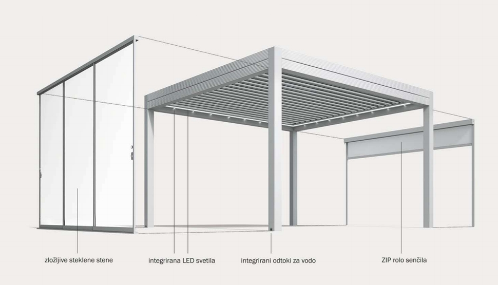 Hermetična pergola z masivno konstrukcijo in ogromno izbiro integrirane dodatne opreme.