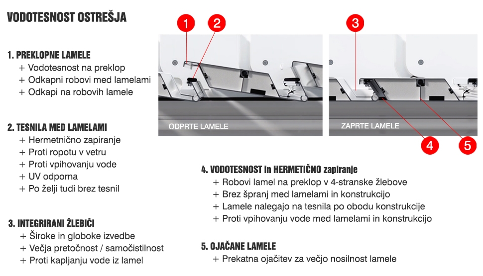 ➤ SIDE SEAL® patentirano tesnenje med zaprtimi lamelami in konstrukcijo pergole.